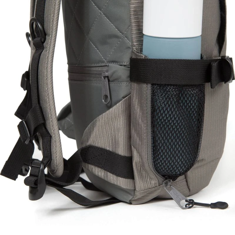 Au premier abord, trois poches zippées sur la partie frontale du sac à dos : deux verticales et une horizontale. Ainsi qu’une autre poche à zip qui se veut discrète en bas au dos du sac et une poche latérale en filet dite « porte-bouteille ». Il y a également la présence de sangles latérales de compression qui permettent de maitriser le volume global. A l’ouverture son intérieur est entièrement doublé et se scinde en 2 compartiments qui offrent de l’espace pour un rangement optimal pour documents A4, classeurs, etc. Dans l’un des 2 espaces se trouve une partie dédiée rembourrée pour conserver en toute sécurité un ordinateur portable de 15 pouces avec une attache velcro pour aider à maintenir en place.