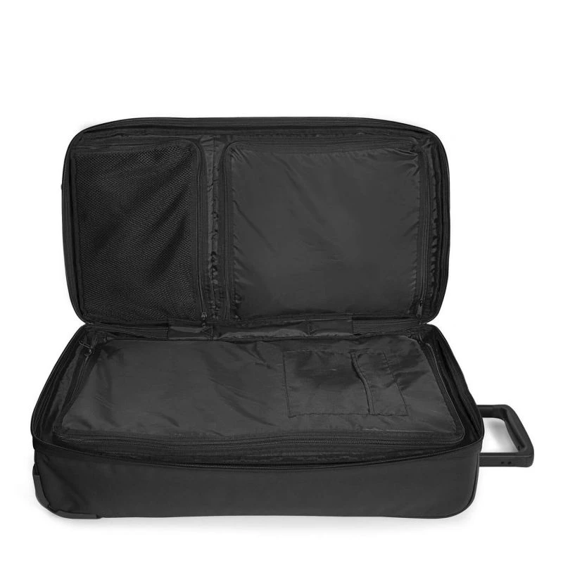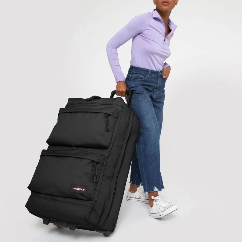 Pour permettre un transport confortable, ce sac souple Eastpak possède une poignée télescopique double tube et de deux roulettes intégrées fluides pour permettre le tractage facilement. Des renforts de protections sont positionnés au dos, aux coins et autour des roues pour assurer la durabilité du bagage contre les chocs et frottements. Si besoin, comme lors de passage dans des escaliers, une poignée de portage se trouve sur le haut du bagage pour le tenir à la main.